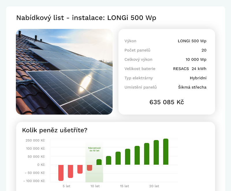 Nabídkový list v unikátním grafickém zpracování obsahuje kompletní souhrn cenové nabídky včetně grafu, který ukazuje, jak rychle se náklady na instalaci solárních panelů vrátí.