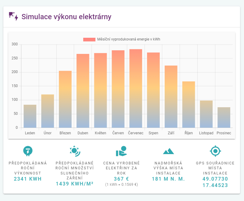 Simulace výkonu elektrárny je graficky zpracovaná, což umožňuje rychlou a přehlednou vizualizaci výsledků a usnadňuje tak rozhodování zákazníkům. Tato funkce je výjimečná a umožňuje obchodníkům s fotovoltaikou poskytnout svým zákazníkům ještě přesnější a spolehlivější informace o výkonu solárních panelů.